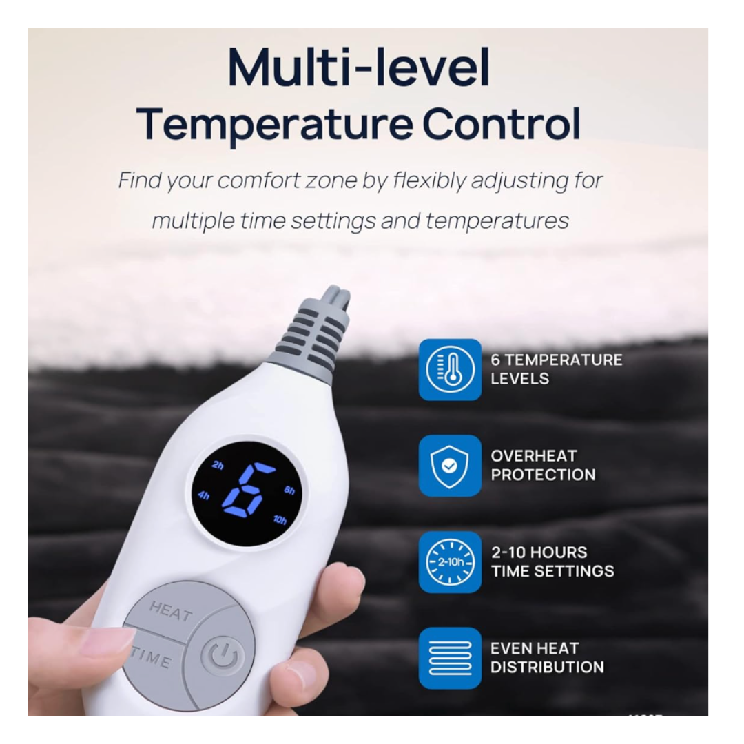 The robe heats up quickly, usually reaching the maximum temperature within 5-10 minutes. It features three adjustable heat settings (Low, Medium, and High) which are easily controlled by a button